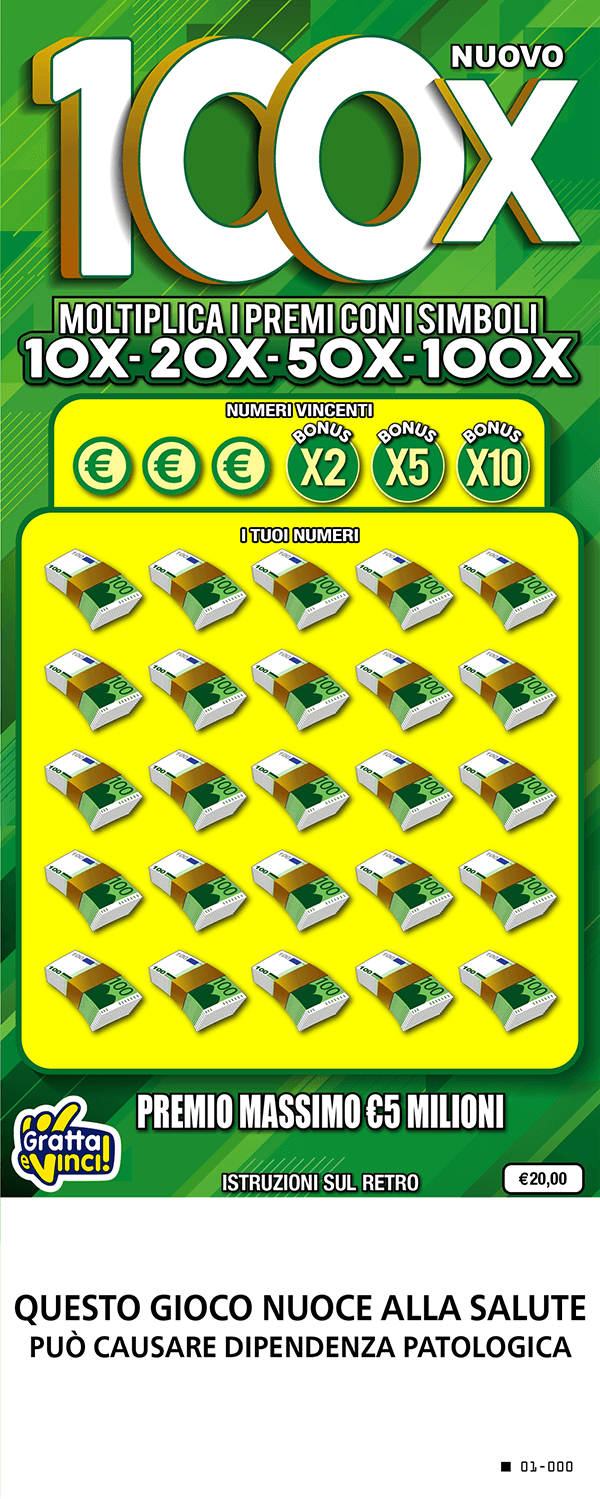 Se ne I TUOI NUMERI trovi, una o più volte, uno o più NUMERI VINCENTI vinci il premio o la somma dei premi corrispondenti, se trovi uno dei numeri BONUS vinci 2 o 5 o 10 volte il premio corrispondente; oppure se ne I TUOI NUMERI trovi il simbolo 10X, 20X, 50X o 100X vinci 10, 20, 50 o 100 volte il premio corrispondente.