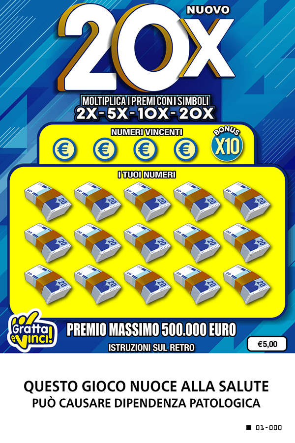 Se ne I TUOI NUMERI trovi, una o più volte, uno o più NUMERI VINCENTI vinci il premio o la somma dei premi corrispondenti, se trovi il numero BONUS vinci 10 volte il premio corrispondente; oppure se ne I TUOI NUMERI trovi il simbolo 2X, 5X, 10X o 20X vinci 2, 5, 10 o 20 volte il premio corrispondente.