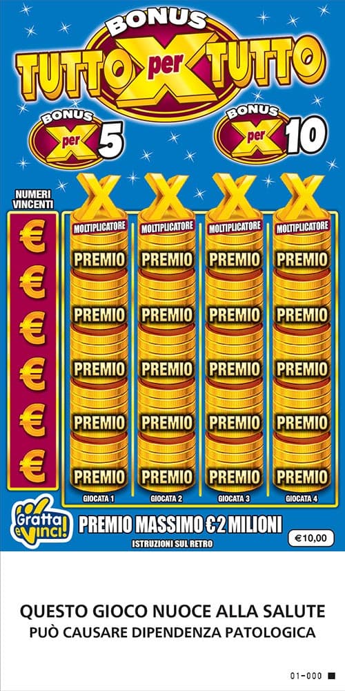 vinci la somma dei premi dell’intera GIOCATA, moltiplicata per il valore del relativo MOLTIPLICATORE. Se sotto le monete trovi il numero BONUS X5 o il numero BONUS X10 vinci 5 o 10 volte il premio corrispondente