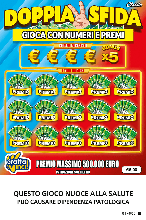 Doppia Sfida Classic è il nuovo biglietto Gratta e Vinci da 5€ con premio massimo pari a 500.000 euro.