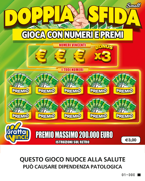 Doppia Sfida Small è il nuovo biglietto Gratta e Vinci da 3€ con premio massimo pari a 200.000 euro. Per giocare basta, grattare I NUMERI VINCENTI e I TUOI NUMERI. Se ne I TUOI NUMERI trovi, una o più volte, uno o più NUMERI VINCENTI, vinci il premio o la somma dei premi corrispondenti. Se trovi il numero BONUS X3, vinci 3 volte il premio corrispondente.Se sotto le scritte PREMIO trovi 3 importi uguali, vinci quell’importo.