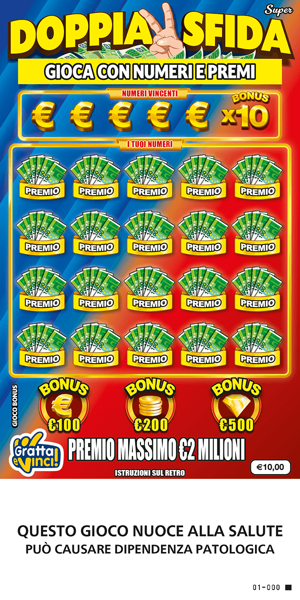 Doppia Sfida Super è il nuovo biglietto Gratta e Vinci da 10€ con premio massimo pari a 2.000.000 euro. Per giocare basta, grattare i NUMERI VINCENTI e I TUOI NUMERI. Se ne I TUOI NUMERI trovi, una o più volte, uno o più NUMERI VINCENTI, vinci il premio o la somma dei premi corrispondenti. Se trovi il NUMERO BONUS X10, vinci 10 volte il premio corrispondente. Se sotto le scritte PREMIO trovi 3 importi uguali, vinci quell’importo. Con il GIOCO BONUS vinci 100€, 200€ o 500€ se sotto i simboli di bonus €100, bonus €200 e bonus €500 trovi il simbolo ![]()