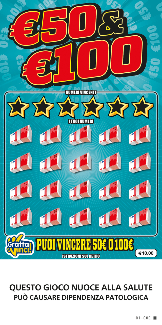 €50&€100 è il nuovo biglietto Gratta e Vinci da 10€ con tanti premi da 50€ e 100€ che possono essere riscossi direttamente presso un qualsiasi punto vendita autorizzato presentando il biglietto vincente.