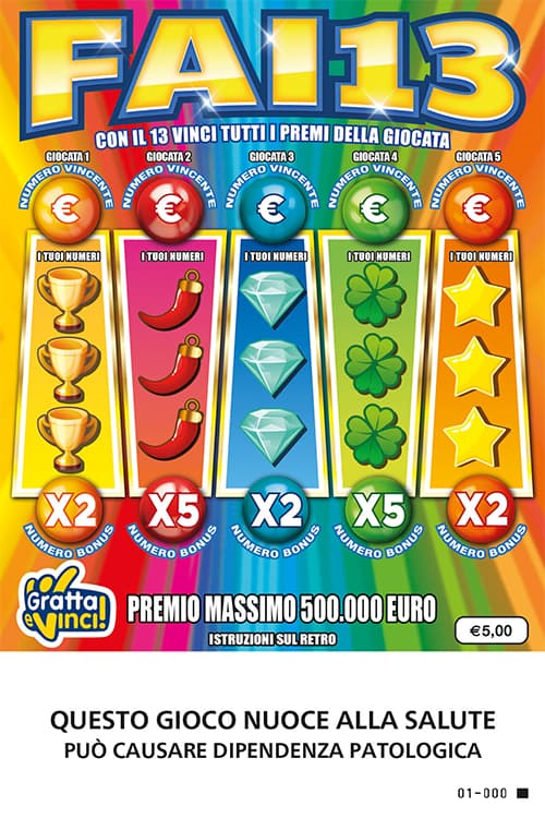 Per ogni giocata: se ne I TUOI NUMERI trovi il NUMERO VINCENTE vinci il premio corrispondente; se ne I TUOI NUMERI trovi il NUMERO BONUS vinci il premio corrispondente moltiplicato per il relativo moltiplicatore; se ne I TUOI NUMERI trovi il numero 13 vinci la somma dei premi della giocata.