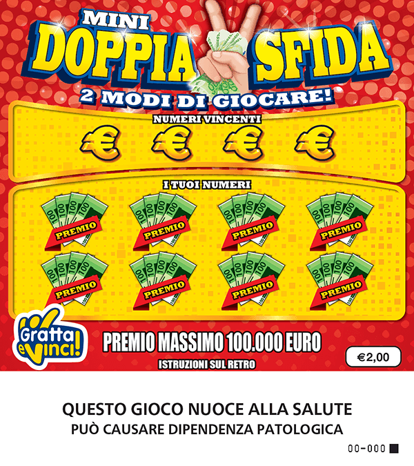 Per premi fino a €500: Probabilità di vincita: 1 biglietto ogni 9,59 esclusi i premi eguali al costo della giocata ai sensi dell’art.9 comma 1ter D.L. n.87/2018 convertito con L. n.96/2018