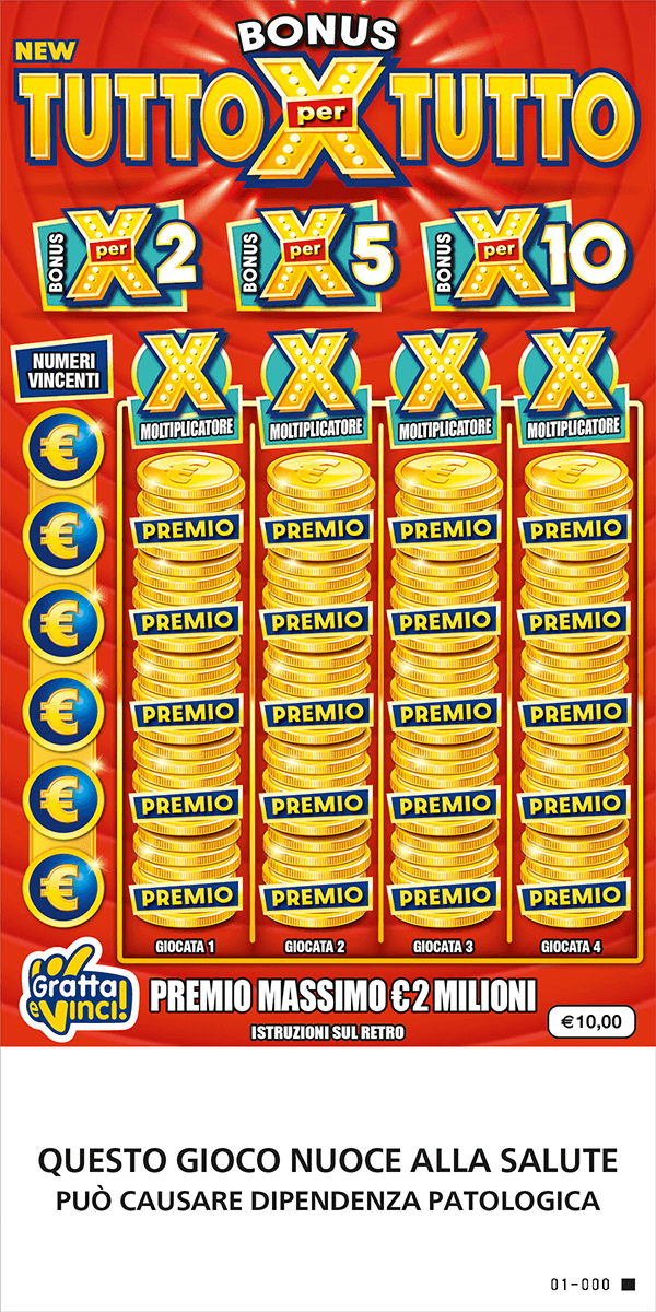 New Bonus Tutto per Tutto è il nuovo biglietto Gratta e Vinci da 10 € con premio massimo pari a 2 milioni di euro.