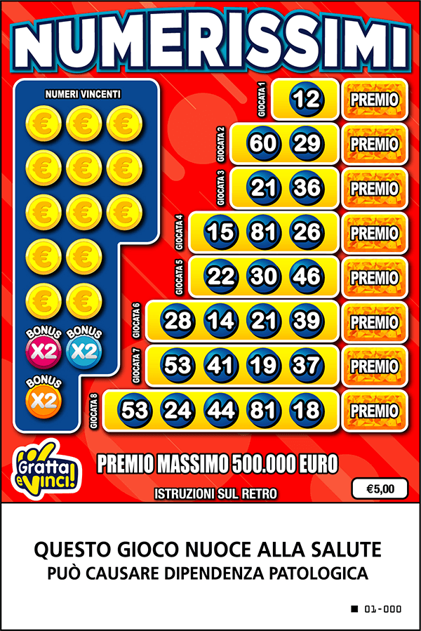 Per ogni GIOCATA: se hai grattato tutti i numeri, vinci il PREMIO indicato; se hai grattato tutti i numeri e tra questi è presente un numero "BONUS X2", vinci il doppio del PREMIO indicato.