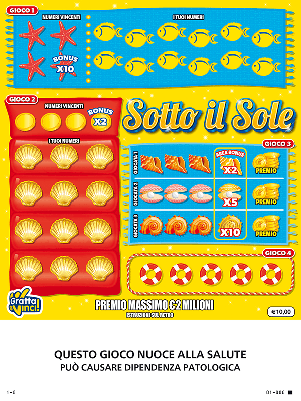Sotto il Sole è il nuovo biglietto gratta e vinci da 10€ con premio massimo pari a 2 milioni di euro. Nel biglietto sono presenti 4 giochi differenti.