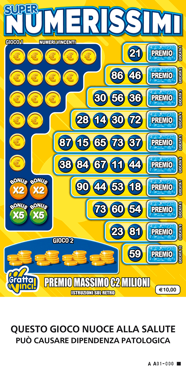 Gioco 1: Gratta tutti i NUMERI VINCENTI compresi i numeri BONUS X2 e BONUS X5. Poi, in ogni GIOCATA, gratta solo i numeri corrispondenti ai NUMERI VINCENTI. Per ogni GIOCATA: se hai grattato tutti i numeri vinci il PREMIO indicato; se hai grattato tutti i numeri e tra questi è presente un numero BONUS X2 o un numero BONUS X5 vinci, rispettivamente, 2 o 5 volte il PREMIO indicato.